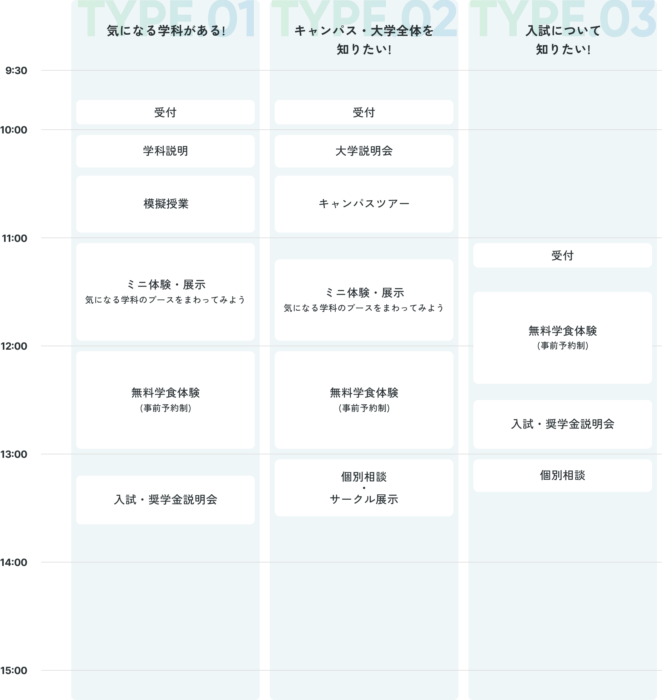 大学説明会、キャンパスツアー、模擬授業等、体験イベントが盛りだくさん。気になることは在学生や教職員に気軽に聞くことができます。